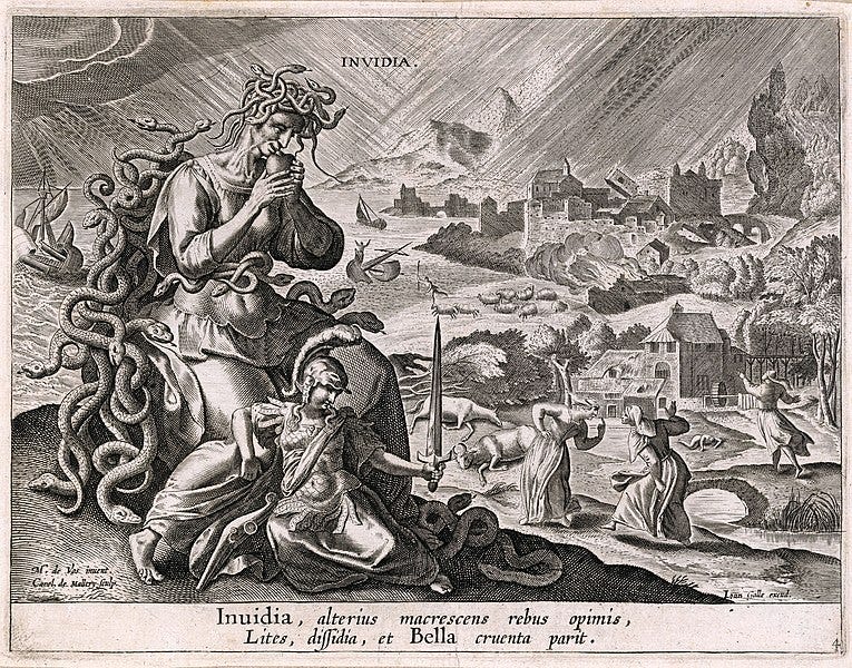 The goddess Invidia was often depicted with a serpent coiled around her breast and biting her heart to signify her self-devouring bitterness. It’s the perfect illustration of stage three invidia. We’re like the goddess, wrapping serpents around our flesh to drip venom into our veins. Like cancer, envy mutates the goodness within us, leaving us incapable of genuine happiness.