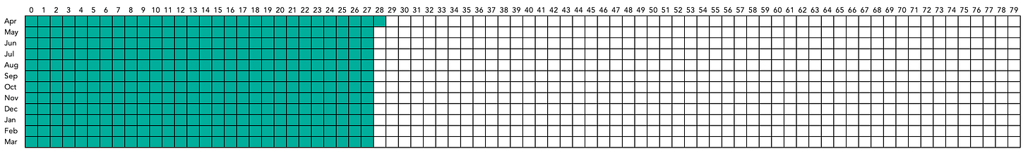 I turned 28 last week. Late-twenties are an odd age—a major fork in life’s road. For some career-oriented urbanites, 30 is the new 20. For other family-oriented suburbanites, the biological clock is ticking. Men’s testosterone declines, s0 the window for fathering healthy kids shrinks. This mindset triggers a domino effect of activities: Marriage, home-ownership, career settling, and so on. While both the Barney Stinson and Marshall Eriksen views on age are valid, it’s a false dichotomy that leaves little room for the nuances that make life interesting. That said, there’s an objectivity to age. Tim Urban’s Wait But Why article explains it well with charts like this: